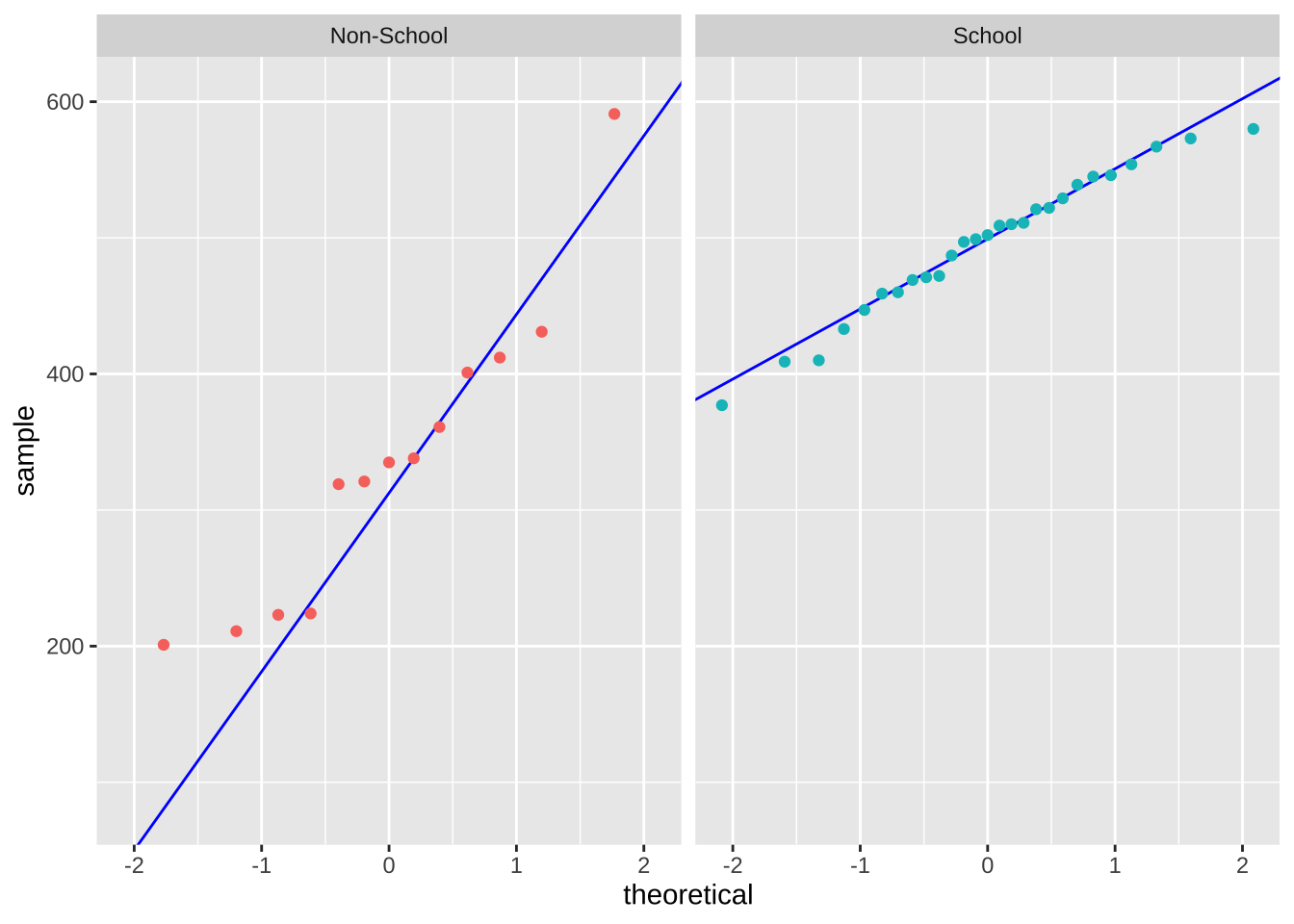 alternative hypothesis: true difference in means between group Non-School and group School is not equal to 0