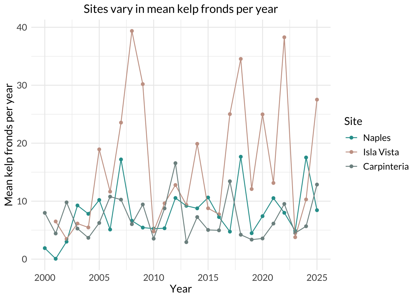 Carpinteria had the least variable mean kelp fronds per year because its line stays relatively flat and spans a narrower range of y-values than the other two sites, remaining mostly around 3 to 13 fronds per year with one higher point (Naples have ~3 that goes higher than 13). This indicates smaller changes from year to year compared with Naples and Isla Vista.