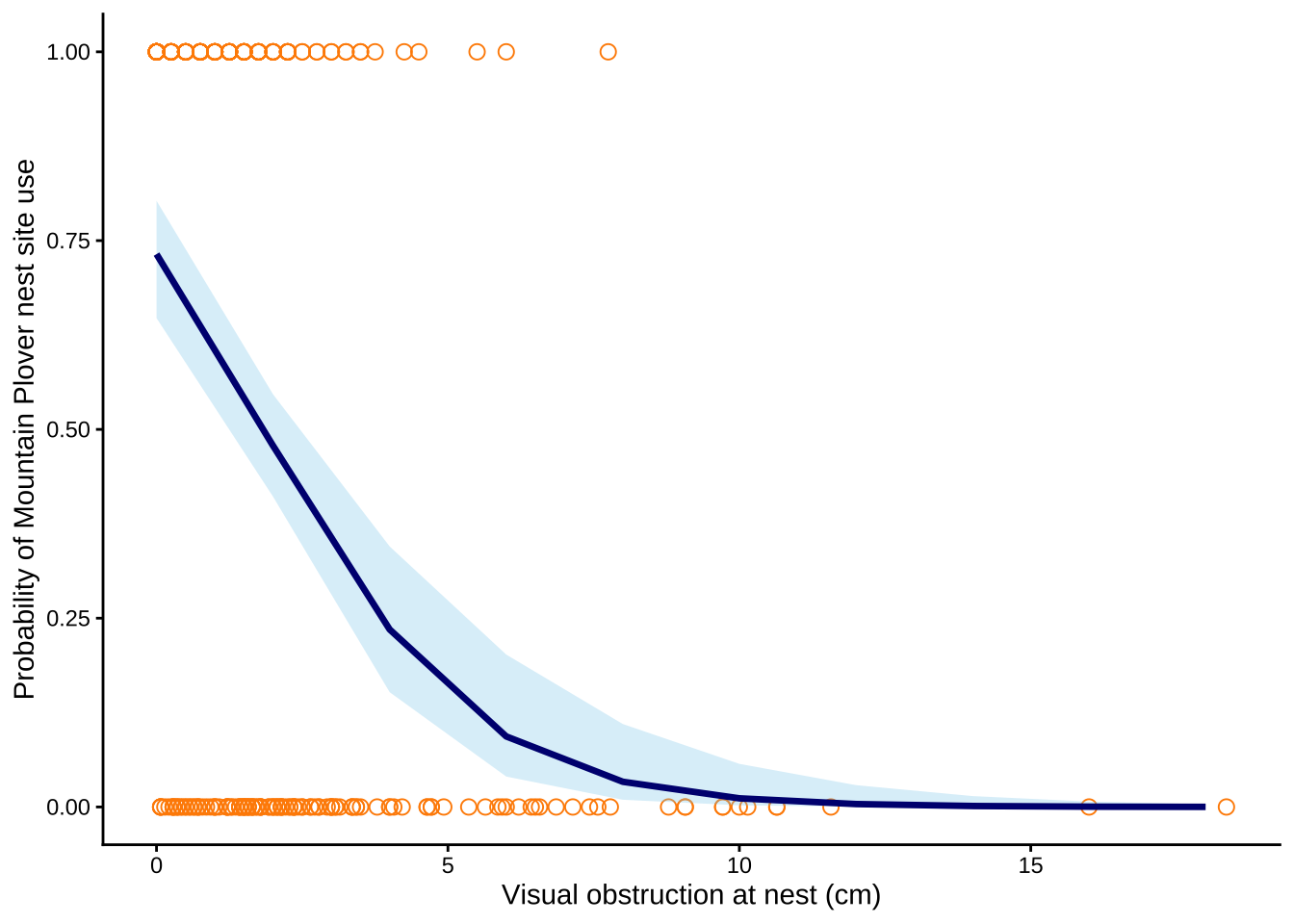 Mountain Plover nest site occupancy was highest when visual obstruction was low, and with every 1 cm increase in visual obstruction, the odds of Mountain Plover occupying a nest site decreased by a factor of 0.58 (95% CI: [0.47, 0.69], p = <0.001, α = 0.05). At 0 cm visual obstruction, the predicted probability of nest site occupancy was 0.73 (95% CI: [0.65, 0.80]), indicating that plovers strongly prefer open nesting areas. As shown in Figure 1, the probability of nest site use decreases as visual obstruction increases, suggesting that taller or denser vegetation decreases habitat suitability for Mountain Plovers. This pattern likely occurs because Mountain Plovers nest in open habitats with short, sparse vegetation and large amounts of bare ground, which allows them to detect predators and blend into the surrounding soil. Distance to prairie dog colony edge was not included in the best-supported model and therefore did not appear to explain occupancy as well as visual obstruction in this dataset.