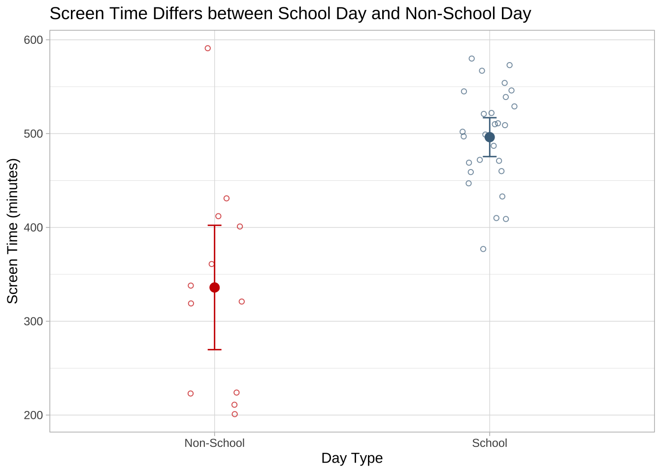 We found a large (Glass’s delta = -3.06) effect of day type on mean screen time between School day and Non-school day (Welch’s two-sample t-test, t(14.70)=−5.00, p = <0.001, α = 0.05). On average, screen time was about 160.2 minutes higher on school days than on non-school days, with mean screen time of 496.2 minutes on school days and 336.0 minutes on non-school days (the 95% confidence interval: [91.8, 228.7] minutes).